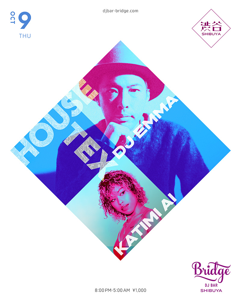 HOUSE-TEXにはDJ EMMAが選んだゲストDJが招かれ、最終電車で帰る人達にも踊って欲しいと自ら22:00からプレイ。精細放つ腕利きDJ達の選曲が朝まで続き、朝方になるとスクランブル交差点が垣間見える窓から陽光が射し込むのも渋谷Bridgeならでは。