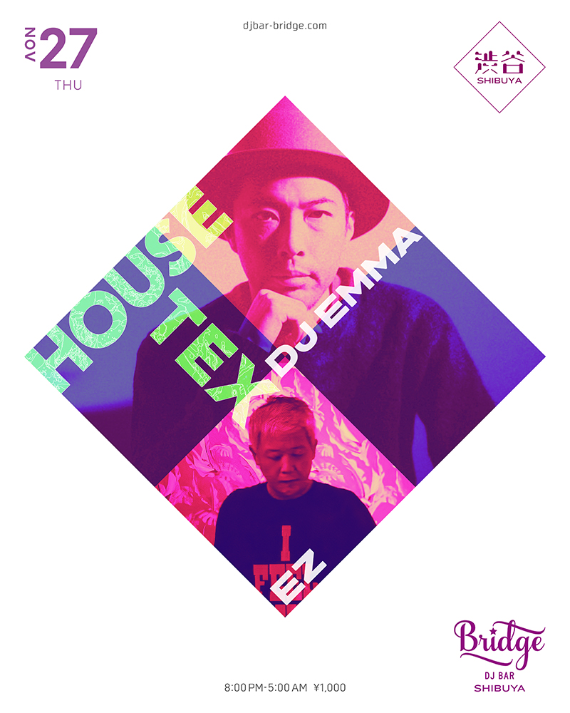 HOUSE-TEXにはDJ EMMAが選んだゲストDJが招かれ、最終電車で帰る人達にも踊って欲しいと自ら22:00からプレイ。精細放つ腕利きDJ達の選曲が朝まで続き、朝方になるとスクランブル交差点が垣間見える窓から陽光が射し込むのも渋谷Bridgeならでは。