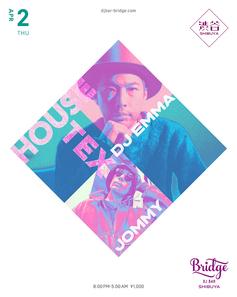 HOUSE-TEXにはDJ EMMAが選んだゲストDJが招かれ、最終電車で帰る人達にも踊って欲しいと自ら22:00からプレイ。精細放つ腕利きDJ達の選曲が朝まで続き、朝方になるとスクランブル交差点が垣間見える窓から陽光が射し込むのも渋谷Bridgeならでは。
