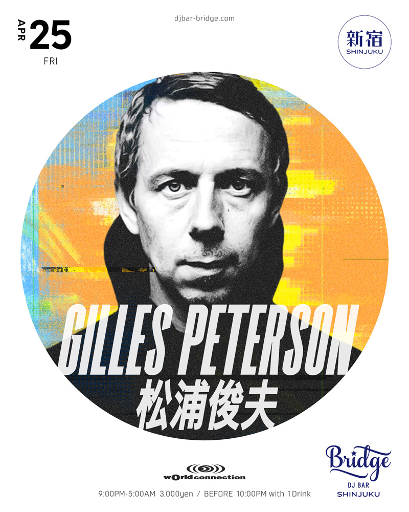 世界中の音楽を知り尽くし、常に新たな才能とサウンドを紹介し続けてきたDJ、ジャイルス・ピーターソン。 前回O-Eastでの圧巻のステージから2年。今回はDJ Bar Bridge新宿のリラックスした空間のなか、22:30よりロングセットを披露。 国境も時代もジャンルも超えて、音楽への愛を惜しみなく注ぐそのプレイは、きっと私たちを魅了してくれるはず。 “パーフェクト・ビート”を共に探す、特別な夜を。