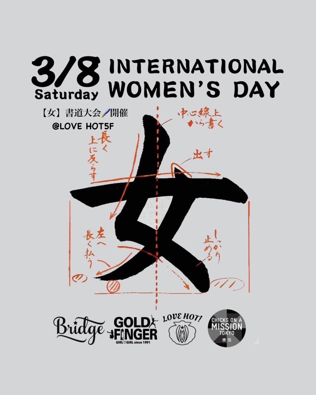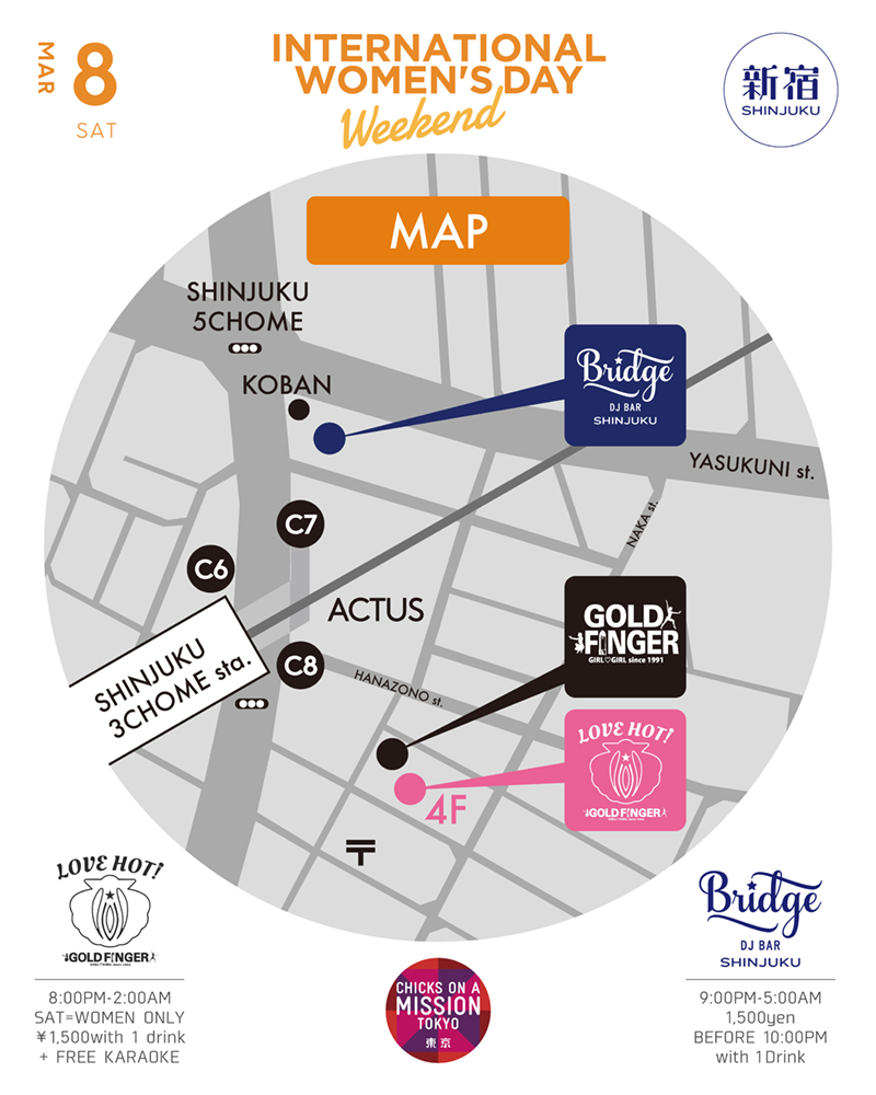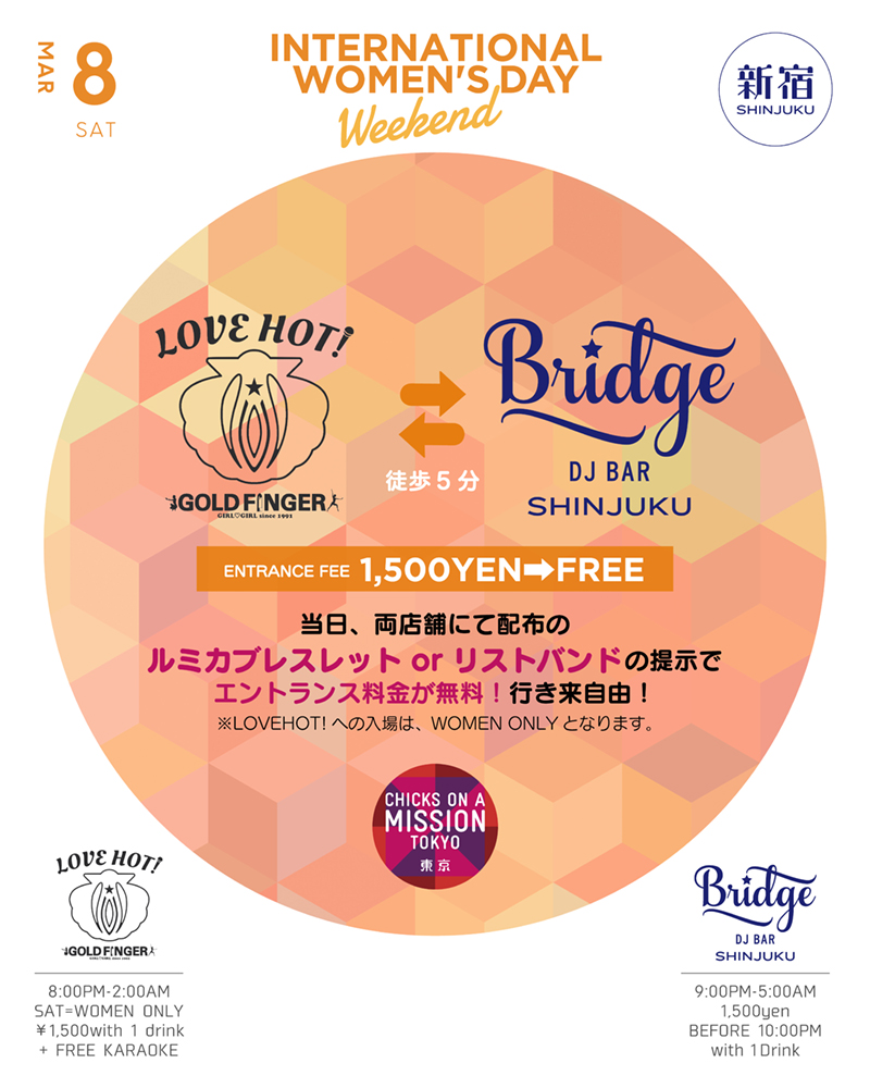 Shinjuku Bridge teams up with ‘Love Hot!’ The hottest new bar by Gold Finger in Shinjuku 2-chome’s for a special International Women’s Day event.