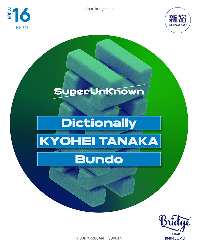 SuperUnKnownはUKG、ダブステッププロデューサーのDictionallyとハウスプロデューサーのKYOHEI TANAKAのマンスリーイベント